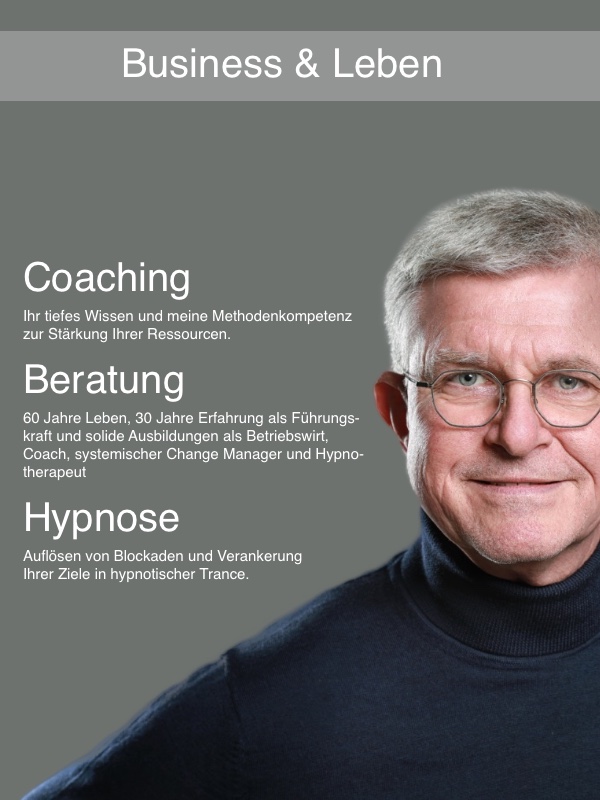 Als langjährige Führungskraft auf Geschäftsleitungsebene habe ich umfassende praktische Erfahrungen in den Bereichen Planung, Zielsetzung, Strategie, Maßnahmenplanung, Führung, Tagesgeschäft und Reorganisation sammeln können. Auch im Privatleben durfte ich schon viele glückliche als auch sehr herausfordernde Momente erleben und habe mich deshalb als Persönlichkeit durch verschiedene Maßnahmen stets gerne weiterentwickelt. Trotz aller Erfahrungen wahre ich jederzeit die kritische Selbstdistanz, um meine Erfahrungen nicht auf Ihre Situation zu übertragen.